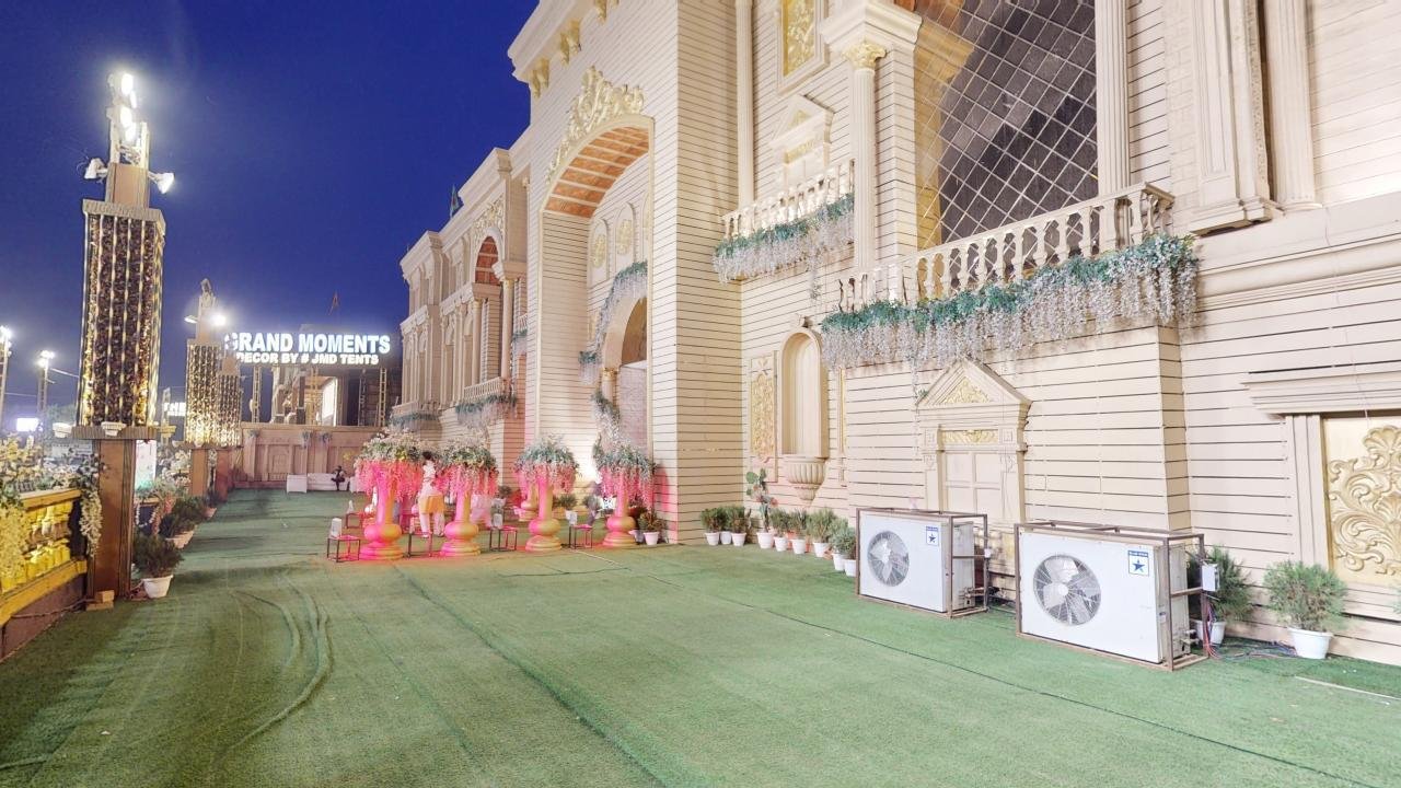 The exterior of Grand Moments JMD Tents boasts an impressive architectural design, exuding opulence and grandeur from the moment you arrive. The venue is surrounded by lush greenery, creating a serene and enchanting ambiance that sets the stage for unforgettable events.